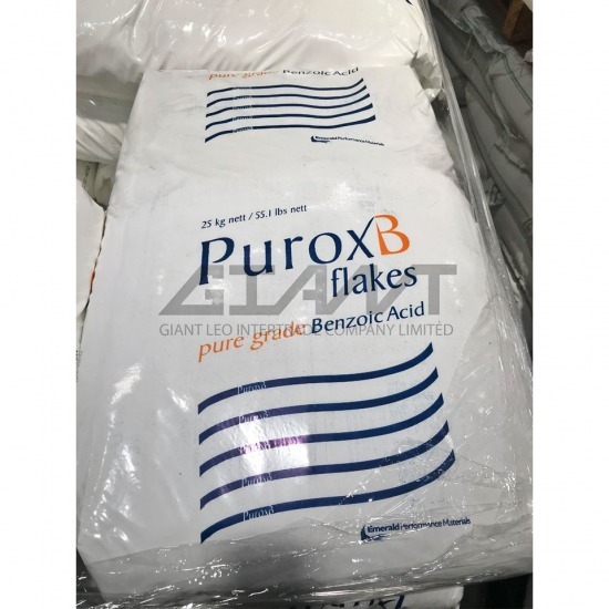 Benzoic Acid กรดเบนโซอิก (Purox B flakes) Emerald Kalama   Benzoic Acid CAS No.: 000065-85-0 Synonym(s): Benzenecarboxylic acid; Benzeneformic acid; Phenylcarboxylic acid; Carboxybenzene ชื่ออื่น: Benzenecarboxylic acid; Benzeneformic acid; Phenylcarboxylic acid; Carboxybenzene Brand: Emerald Kalama Grade: Industrial เกรด: อุตสาหกรรม Physical description: White flakes ลักษณะ: เกร็ดสีขาว Country of Origin: Netherlands แหล่งผลิต: ประเทศเนเธอร์แลนด์ Specification: Assay : 99.9% Min Water : 0.5% max Packaging: 25 kg. ขนาดบรรจุ: 25 กก. Application การใช้งาน: - Additive - Industrial applications   Remarks: Information listed in the ‘Specification’ section may not be complete. Please do not hesitate to contact us for an official copy of the product specification / certificate of analysis. หมายเหตุ: ข้อมูลจำเพาะนี้อาจมีรายละเอียดไม่ครบถ้วน กรุณาติดต่อบริษัทฯ หากท่านต้องการสำเนาข้อมูลจำเพาะฉบับเต็ม ที่อยู่: 2/2-4 หมู่ 2 ถนนสุขสวัสดิ์ 43 ตำบลบางครุ อำเภอพระประแดง จังหวัดสมุทรปราการ 10130 โทรศัพท์: 0-2819-0140-4, 0-2463-8619, 0-2463-6138, 08-1913-4394 โทรสาร: 0-2464-1062, 0-2819-2514 อีเมล์: sales@giantleo.com ,service@giantleo.com